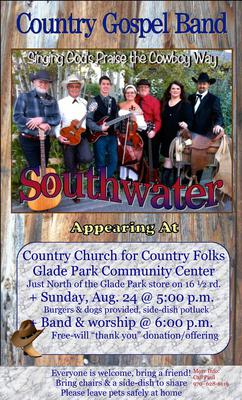 Glade Park Bible Church (Pastor Paul Lehman) and First United Methodist Church (Rev. Blaine Scott)are hosting the last Country Church of the summer. Enjoy good food, music and fellowship. For more information or to RSVP (would help us but not necessary) call Pastor Paul at 628-6119.
